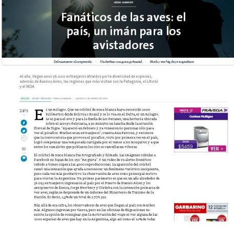 El colibrí de nuca blanca fue fotografiado y filmado. Las imágenes subidas a Facebook no bajan de los 150 "me gusta". Y un video de su aleteo frenético subido a Vimeo supera las 4000 reproducciones. La aparición del colibrí causó una sensación que ayuda a reconocer un fenómeno turístico incipiente, pero cada vez más productivo: la observación de aves como principal motivo para visitar la Argentina. Un primer parámetro es que en un año alrededor de 36.093 extranjeros ingresaron al país por el Puerto de Buenos Aires y los aeropuertos de Ezeiza, Jorge Newbery y Córdoba con la intención primaria de ver aves, según se desprende de un informe del Ministerio de Turismo de la Nación. Es decir, 1,3% de un total de 2.776.392.