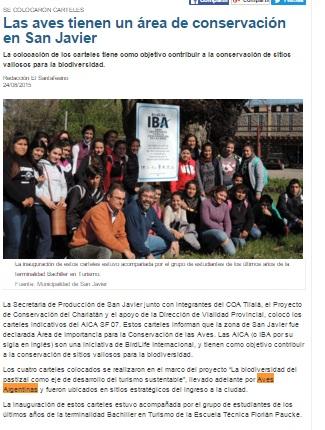 La Secretaría de Producción de San Javier junto con integrantes del COA Tilalá, el Proyecto de Conservación del Charlatán y el apoyo de la Dirección de Vialidad Provincial, colocó los carteles indicativos del AICA SF 07. Estos carteles informan que la zona de San Javier fue declarada Área de Importancia para la Conservación de las Aves. Las AICA (o IBA por su sigla en inglés) son una iniciativa de BirdLife Internacional, y tienen como objetivo contribuir a la conservación de sitios valiosos para la biodiversidad.