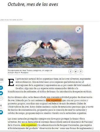 En octubre, mes mundial de las aves en homenaje al patrono de la ecología San Francisco de Asís, vale el reconocimiento a la incansable y muchas veces silenciosa tarea de personas e instituciones públicas y privadas dedicadas a la conservación de la biodiversidad que contribuyen a garantizar la sostenibilidad ambiental de nuestro país.