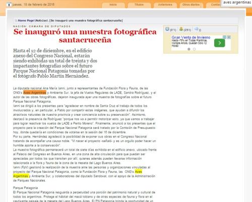 Noviembre 20 de 2014. Hasta el 12 de diciembre, en el edificio anexo del Congreso Nacional, estarán siendo exhibidas un total de treinta y dos impactantes fotografías sobre el futuro Parque Nacional Patagonia tomadas por el fotógrafo Pablo Martín Hernández.