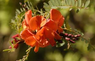 Otros nombres: Sesbania punicea Hábito: arbusto Altura: 1,5 a 4 Crecimiento: Rápido Follaje: Caedizo tardío Atractivo: Flores rojas Riego: mucho Sol: medio Arbustos Sesbania punicea
