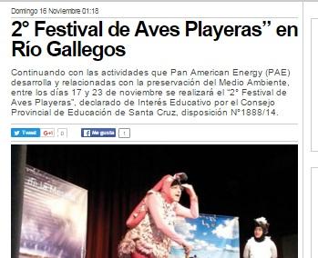 Continuando con las actividades que Pan American Energy (PAE) desarrolla y relacionadas con la preservación del Medio Ambiente, entre los días 17 y 23 de noviembre se realizará el “2° Festival de Aves Playeras”, declarado de Interés Educativo por el Consejo Provincial de Educación de Santa Cruz, disposición N°1888/14.
