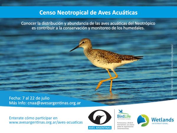 Entre los días 7 y 22 de julio se llevará a cabo un nuevo conteo Censo Neotropical de Aves Acuáticas. Esta actividad es organizada por Wetlands International y coordinado en nuestro país por Aves Argentinas desde el año 2010.