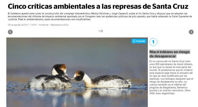 En la cuenca del río Santa Cruz viven unos 800 ejemplares de macá tobiano, un ave que no existe en otra parte del mundo. El problema es que en invierno esta especie baja hasta el estuario del río que se verá modificado por las represas. Los biólogos aseguran que el riesgo de desaparecer es alto. La cuenca también es el hábitat del pingüino de Magallanes, flamenco austral y el chorlito ceniciento.