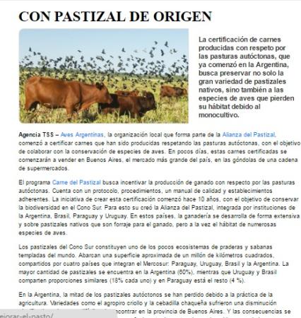 El programa Carne del Pastizal busca incentivar la producción de ganado con respecto por las pasturas autóctonas. Cuenta con un protocolo, procedimientos, un manual de calidad y establecimientos adherentes. La iniciativa de crear esta certificación comenzó hace 10 años, con el objetivo de conservar la biodiversidad en el Cono Sur. Para esto su creó la Alianza del Pastizal, integrada por instituciones de la Argentina, Brasil, Paraguay y Uruguay. En estos países, la ganadería se desarrolla de forma extensiva y sobre pastizales nativos que son forraje para el ganado, pero a la vez el hábitat de numerosas especies de aves.