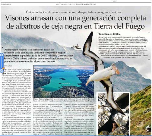 En este caso los visones depredaron una generación completa de albatros de ceja negra (especie amenazada) en la isla de Tierra del Fuego.