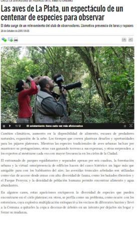 Para llegar a esa cifra, durante dos años los miembros del COA -un club formado en 2007 por aficionados locales del avistamiento de aves- realizaron un censo de la avifauna platense en parques y plazas del casco urbano. Osvaldo Freyre, uno de sus integrantes más activos, explicó que todos los fines de semanas salieron en grupo por distintos sectores de la ciudad para registrar especies de aves. El relevamiento, subrayó, se hizo diferentes épocas, “porque hay aves que aparecen en distintos momentos del año”.