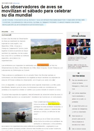 El Gran Día Mundial de Observación de Aves se celebrará de manera especial en esta región, con Argentina, Chile, Uruguay y Paraguay "pajareando" juntos, para registrar durante la jornada la mayor cantidad de especies, de las cuales hay unas 300 a confirmar en territorio argentino, anunciaron los organizadores.