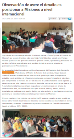 En la presentación institucional que contó con la presencia del Presidente de la Asociación Aves Argentinas, Mario Costa, el Ministro de Turismo de la provincia, Sergio Dobrusin comentó-“acordamos desarrollar una mas critica de guías capacitados,de alojamientos amigables con la actividad, de infraestructura adecuada, sumando fotografía de naturaleza para complementar el mercado. En la Feria de Aves de Londres hablamos con la agencias y sabemos que nos falta, tenemos un camino a desarrollar ya que una provincia que tiene el 50 % de la biodiversidad de aves del país no puede ser un destino menor con el tema de observación de aves, este desafío es tanto para el sector publico y privado, es muy importante que posicionemos a nuestro destino con este producto ya que tenemos un enorme potencial y es verdaderamente sustentable para el turismo de Misiones”.