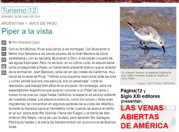 Con su film Bichos, Pixar popularizó a las hormigas. Con Buscando a Nemo hizo famosos a los peces payaso de la Gran Barrera de Coral australiana y con su secuela, Buscando a Dory, a los peces cirujano de las aguas tropicales. Pero no es todo: en su último corto, el estudio tiene como protagonista a Piper, un hambriento playerito blanco que el director de la animación, Alan Barillaro, solía ver en las costas de California, muy cerca de la sede de Pixar. “Viendo a los playeros reaccionar ante las olas y correr, pensé que era una película, era un personaje”, contó el realizador, que trabajó tres años en el proyecto. Sin embargo, para los espectadores argentinos que quieran conocer a un Piper de carne y hueso no es preciso viajar hasta California: la especie es asidua visitante de nuestras costas. Los playeros blancos, como los rojizos y otras aves migratorias, se concentran en algunos sectores de la costa del Atlántico durante su travesía hacia el hemisferio norte, cuando se acerca el otoño en el sur: sobre todo Río Grande (Tierra del Fuego) y la bahía de San Antonio (Río Negro, cerca de Las Grutas), pero también Río Gallegos, Península Valdés y la bahía de Samborombón en la provincia de Buenos Aires.