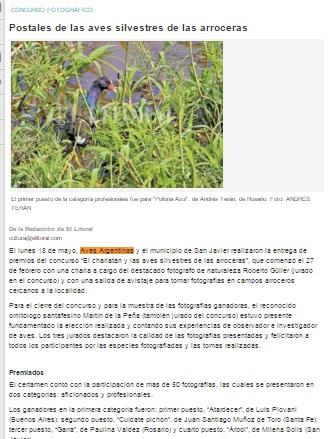 El lunes 18 de mayo, Aves Argentinas y el municipio de San Javier realizaron la entrega de premios del concurso “El charlatán y las aves silvestres de las arroceras”, que comenzó el 27 de febrero con una charla a cargo del destacado fotógrafo de naturaleza Roberto Güller (jurado en el concurso) y con una salida de avistaje para tomar fotografías en campos arroceros cercanos a la localidad.