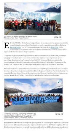 "Elegimos el glaciar, como lugar simbólico del nacimiento del río Santa Cruz, queremos una propuesta alternativa a la construcción de las represas, una superadora que no sacrifique al río Santa Cruz", expresó a LA NACION Mariana Martinez, una de las organizadoras locales del evento denominado Encuentro Nacional en Defensa del Río Santa Cruz "Voces del Río" que fue organizado por la ONG local Río Santa Cruz Libre.