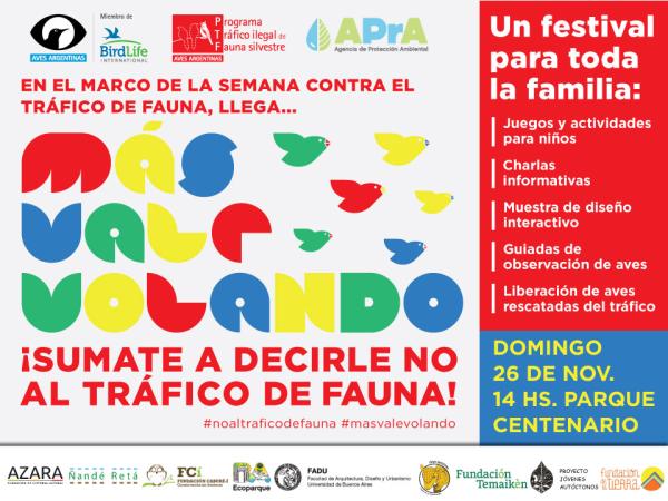 En su tarea para concientizar y difundir esta problemática, Aves Argentinas organiza una jornada contra el tráfico de fauna en todo el país que lleva el nombre de “Más vale volando”. Los eventos centrales serán en el barrio porteño de Caballito, en el Parque Centenario, donde habrá diversas actividades que abordarán esta problemática.