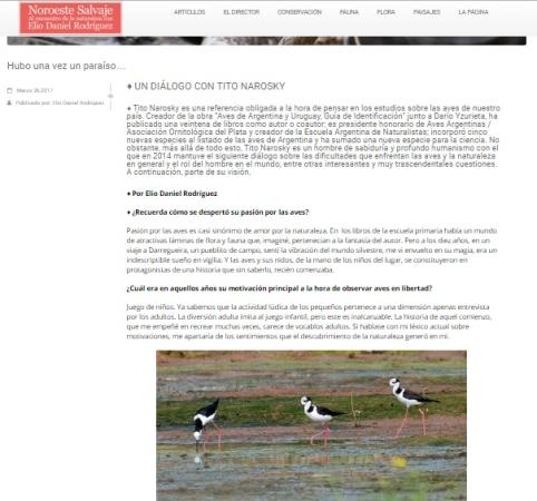 Tito Narosky es una referencia obligada a la hora de pensar en los estudios sobre las aves de nuestro país. Creador de la obra “Aves de Argentina y Uruguay, Guía de Identificación” junto a Darío Yzurieta, ha publicado una veintena de libros como autor o coautor; es presidente honorario de Aves Argentinas / Asociación Ornitológica del Plata y creador de la Escuela Argentina de Naturalistas; incorporó cinco nuevas especies al listado de las aves de Argentina y ha sumado una nueva especie para la ciencia. No obstante, más allá de todo esto, Tito Narosky es un hombre de sabiduría y profundo humanismo con el que en 2014 mantuve el siguiente diálogo sobre las dificultades que enfrentan las aves y la naturaleza en general y el rol del hombre en el mundo, entre otras interesantes y muy trascendentales cuestiones. A continuación, parte de su visión.
