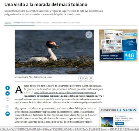 A fines de febrero, tuve la suerte de ser invitado por Toyota y Aves Argentinas a la provincia de Santa Cruz para conocer el esfuerzo que están realizando para salvar al macá tobiano, un ave en peligro de extinción que se encuentra únicamente en territorio argentino . El macá tobiano fue descubierto en 1974 y en aquel entonces se calculaba que había unos 5000 en vida. Actualmente ese número cayó a menos de 800, ubicándolo en la lista crítica de animales en peligro de extinción.