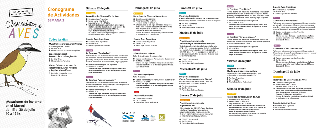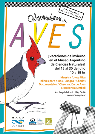 El Museo Argentino de Ciencias Naturales “Bernardino Rivadavia” (MACN) y Aves Argentinas invitan estas vacaciones de invierno una serie de actividades bajo la consigna “Exploradores de la Naturaleza - Observadores de Aves”.