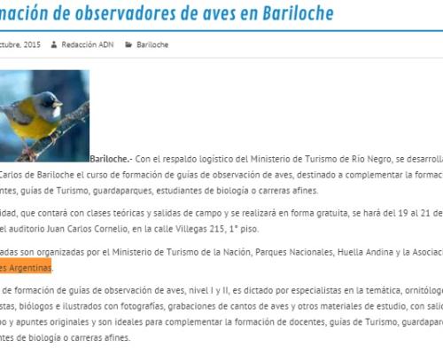Octubre 16 de 2015. Con el respaldo logístico del Ministerio de Turismo de Río Negro, se desarrollará en San Carlos de Bariloche el curso de formación de guías de observación de aves.
