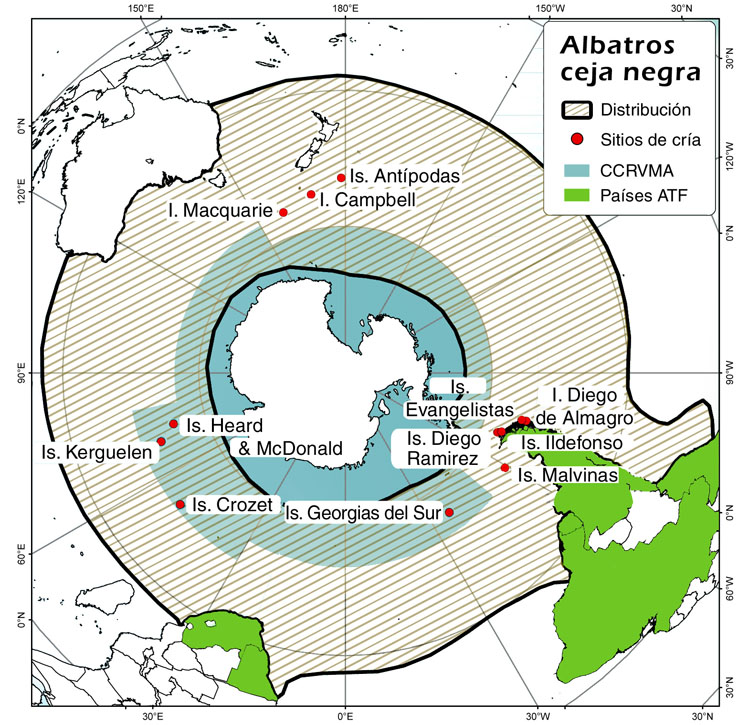 El albatros ceja negra es una especie abundante y su distribución está solapada con la actividad pesquera en las zonas donde se encuentran las especies objetivo de los buques.