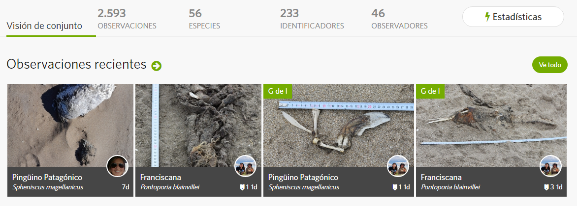 Al encontrar una carcasa durante una recorrida de playa, independientemente que consigamos identificarla o no, registraremos la observación completando algunos datos junto a una o más fotografías. Para ello utilizamos la plataforma de ciencia ciudadana ArgentiNat (versión argentina de la iNaturalist), donde hemos generado el proyecto ECOFAM.